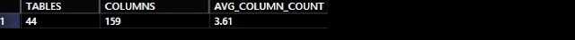 A consulta abaixo retorna o número médio de colunas por tabela em um banco de dados. Query below returns the average number of columns per table in a database.