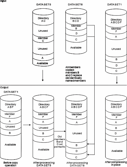 - Member A is not copied from DATASET5 into DATASET1 because it already exists on DATASET1 and the replace option was not specified for DATASET5.