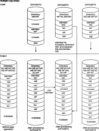 named MD. Member ML is searched for, found, copied to DATASETA and renamed.