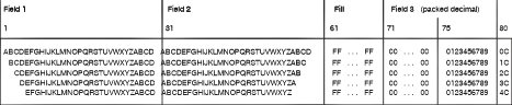 The third field is a 10-byte field containing a packed decimal number (1234567890) to be increased by one after each record is written.
