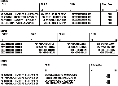 Neste exemplo, os registros de saída são criados a partir de três conjuntos de instruções de controle do utilitário e gravados em três membros