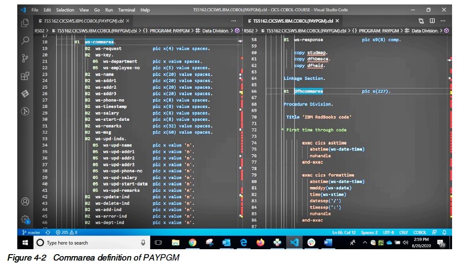 The commarea appears in the Working Storage Section of PAYPGM with its field names specified, and in Linkage section of PAYPGM as a place holder for future
