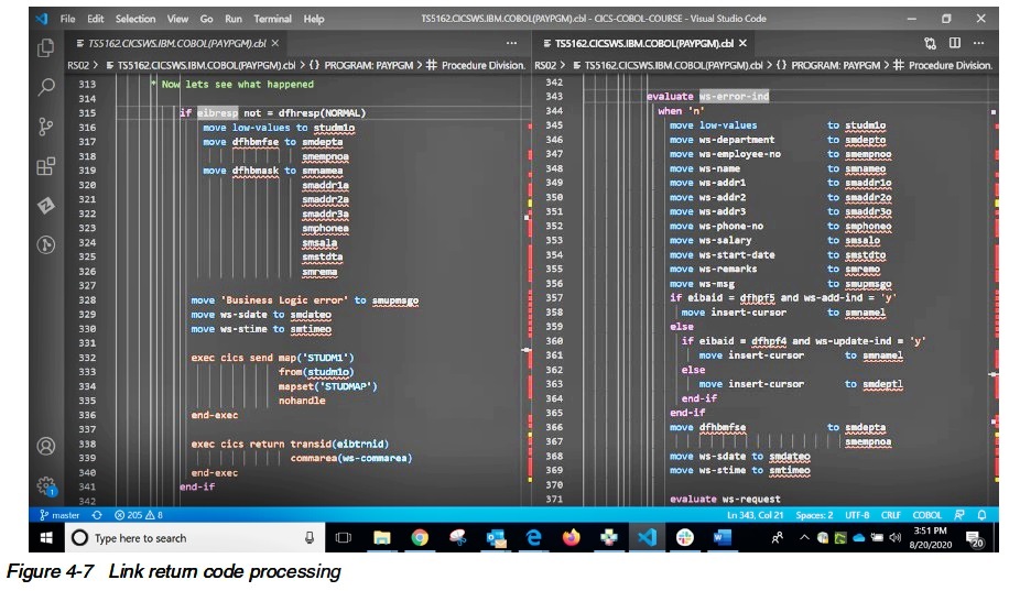 Figure 4-7 starts by checking the return code from the LINK command of the prior screen to see if it executed successfully.