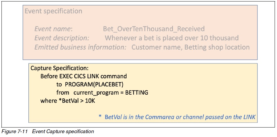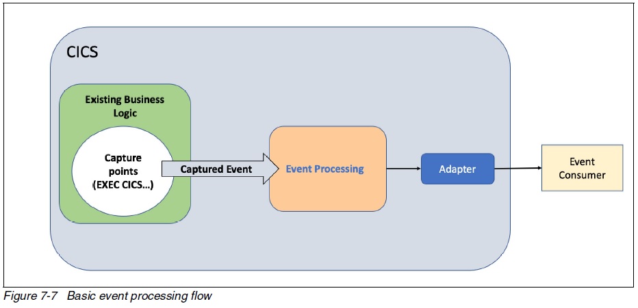 These capture points are based on a subset of existing CICS API – EXEC CICS commands plus a new, Event Processing API – EXEC CICS SIGNAL EVENT. See Figure 7-7.