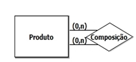 É importante observar que nessa caso a forma de representação é a mesma pois se trata da entidade PRODUTO que mantem um relacionamento COMPOSIÇÂO com ela mesma,
