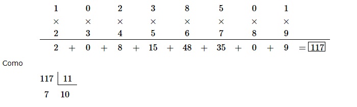 então o resto da divisão de 117 por 11 é 7 e, portanto, o primeiro DV é 7.