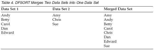 Você também pode usar DFSORT para intercalar (MERGE) data sets. DFSORT mescla (merge) data sets combinando dois ou mais arquivos de registros classificados para formar um único data set de registros ordenados.