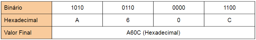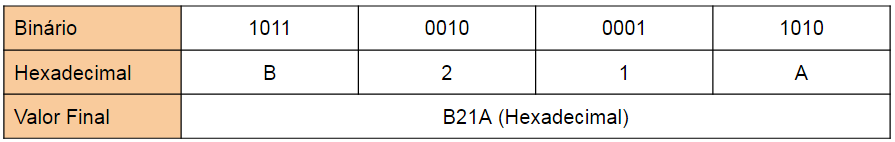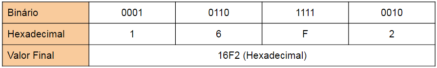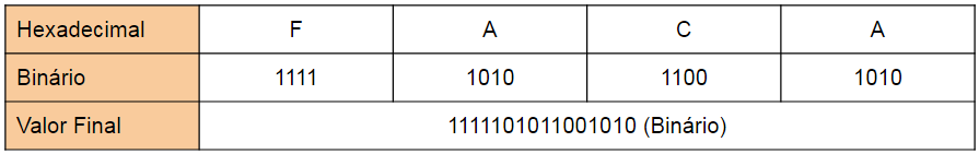 Conversão do sistema hexadecimal para binárioPara converter um número hexadecimal para binário, basta observar a tabela de correspondência abaixo, cada digito em hexadecimal corresponde a quatro