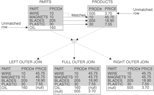 Figure 1. Three outer joins from the PARTS and PRODUCTS tables