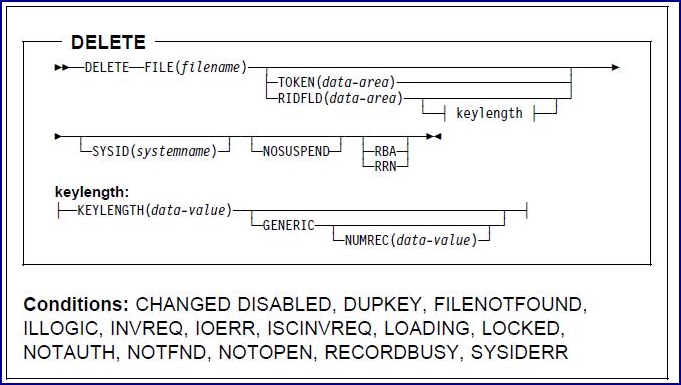 DELETE deletes a record from a KSDS, a KSDS through an alternative index path, or an RRDS. The file can be on a local or a remote system.