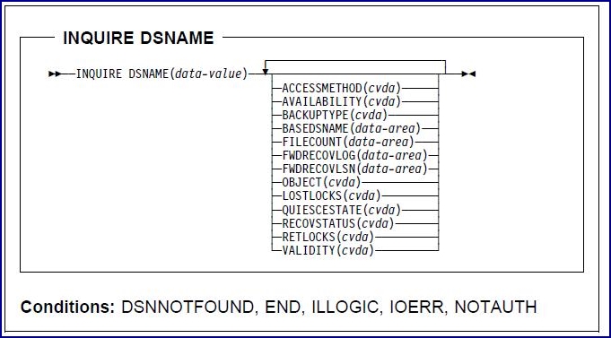 You can also browse through all the objects that are associated with files that are installed in your system. To do this, use the browse options (START, NEXT, and END) on INQUIRE DSNAME commands.