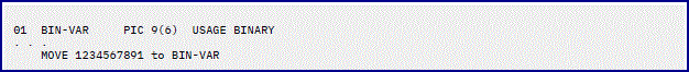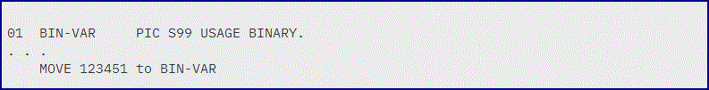 If you compile the program with TRUNC(BIN), the result of the MOVE statement is -7621. The reason for the unusual result is that nonzero high-order digits are truncated. Here, the generated code sequence would merely move the lower halfword quantity X'E23B' to the receiver. Because the new truncated value overflows into the sign bit of the binary halfword, the value becomes a negative number.