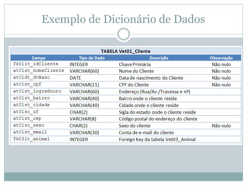 Um dicionário de dados é um documento que descreve as informações representadas no modelo de dados, descrevendo informações de suas entidades e seus atributos ( tamanho, tipos de dado, obrigatoriedade e definição ). O dicionário de dados é usado para documentar os dados da empresa e facilitar a comunicação e entendimento entre analista de sistemas e seus usuários, alem de servir de ferramenta para avaliação de modelos de dados pelos analistas de dados corporativos que tem a responsabilidade de manter o modelo de dados corporativo sem redundancias, completo e de fácil manutenção. Algumas ferramentas CASE geram dicionário de dados automaticamente a partir das informações existentes no catálogo do banco dados. Quando uma organização constrói um dicionário de dados de dimensão empresarial, o intuito deve ser o de padronizar precisamente definições semânticas a serem adotadas na empresa toda; portanto, ele deve incluir tanto definições semânticas como de representação para elementos de dados, sendo que os componentes semânticos focam na criação precisa do significado dos elementos de dados, e de outro lado, as definições de representação indicam como os elementos de dados são armazenados em uma estrutura de computador de acordo com seu tipo, ou seja, se são dados do tipo inteiro, caracter ou formato de data.