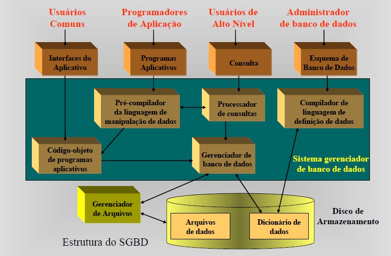 O SGBD é um software responsável pelo armazenamento e gerenciamento de grandes volumes de dados estruturados de acordo com o modelo de dados implementado pelo SGBD e com recursos para acesso e atualização das informações.
