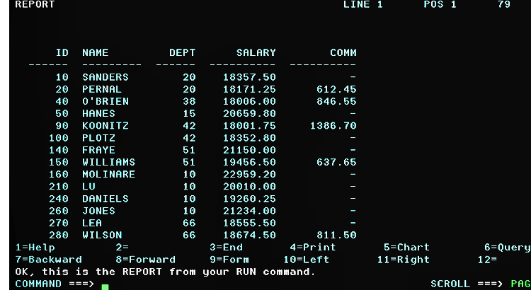 Como podemos ver na listagem, temos os campos ID, Name, Dept, Job, Years, Salary, Comm, podemos nesta tela fazer a rolagem para os proximos registros
