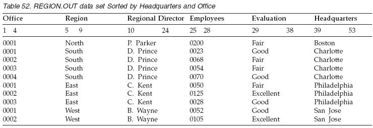 The resulting sorted output records in REGION.OUT are shown in Table 52.