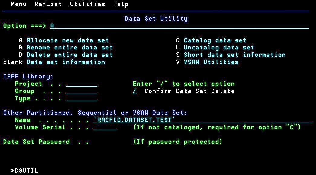 Below example shows command 'A' entered for allocating dataset 'racfid.DATASET.TEST'