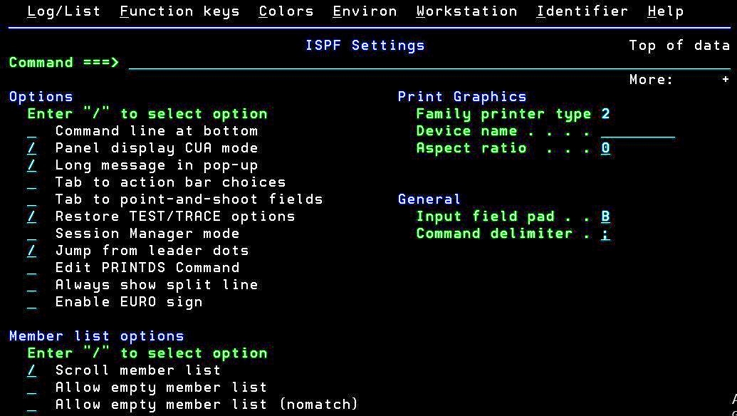 As configurações a seguir estão no primeiro painel Configurações do ISPF, onde você provavelmente deve iniciar quando fizer logon no ISPF (selecione a