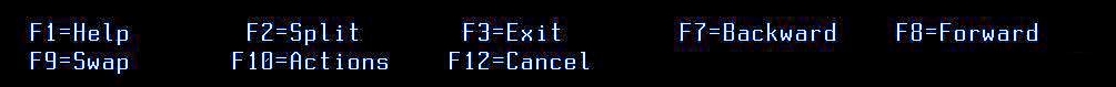 F10 Actions: Moves the cursor to the action bar. If you press F10 a second time, then the cursor moves to the command line.